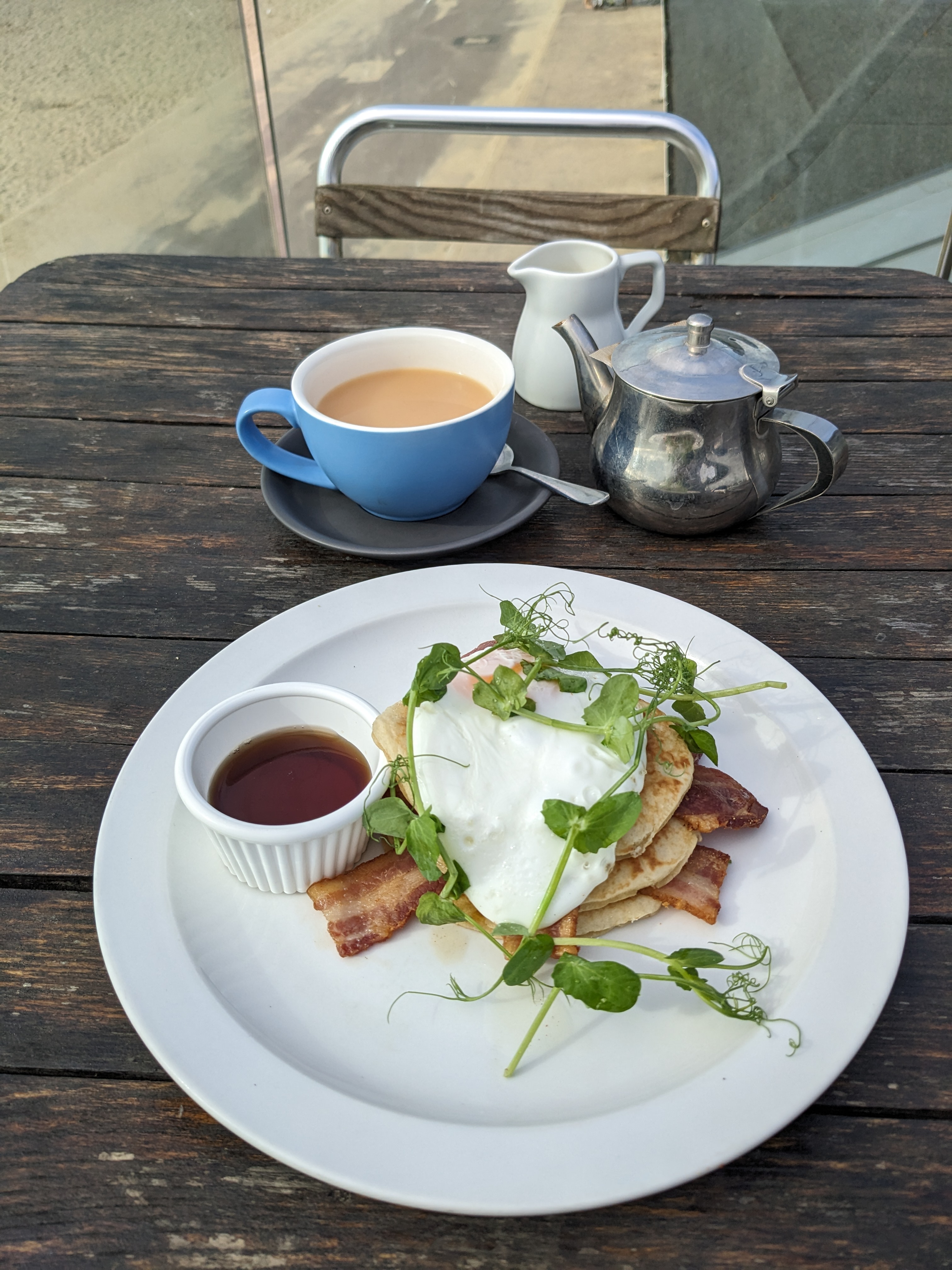 I had a pot of rooibos tea with oat milk and the American pancakes with a fried egg and streaky bacon and maple syrup (which I asked for on the side). All of it was good and the pancakes weren’t too heavy. The menu was all breakfast items but that’s to be expected as I was there mid-morning. I’m assuming the menu changes later in the day.