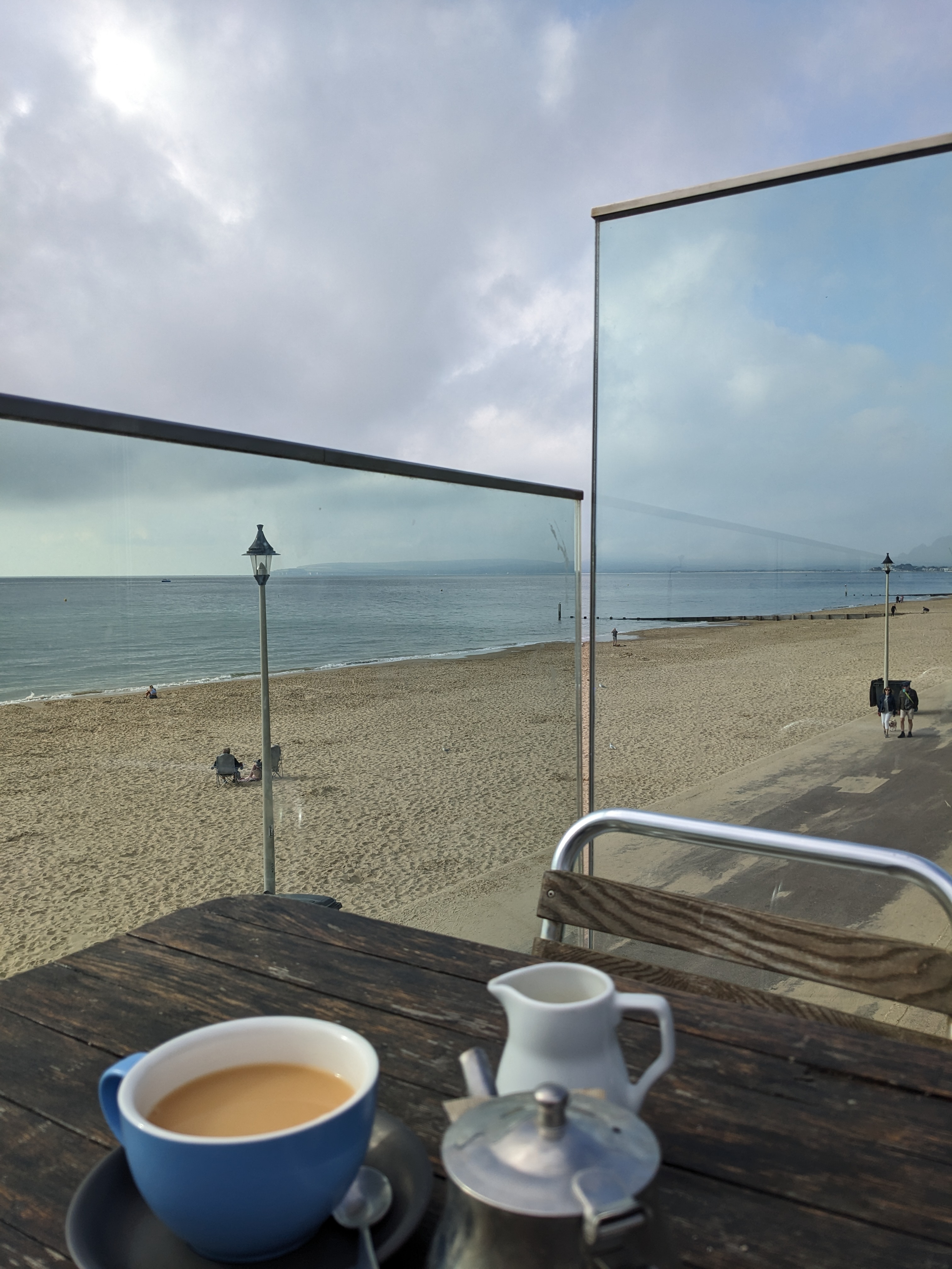 The seating area upstairs is open air, which was just what I wanted on a slightly overcast morning that had the promise of sunshine later. I chose a table in the corner that gave me views of the promenade in front of me and the sea to the side. The upstairs terrace was half full of people – various conversations and the noise of cutlery on plates. Under it all was the sound of the waves, over and over and over. The best soundtrack to any cup of tea.
