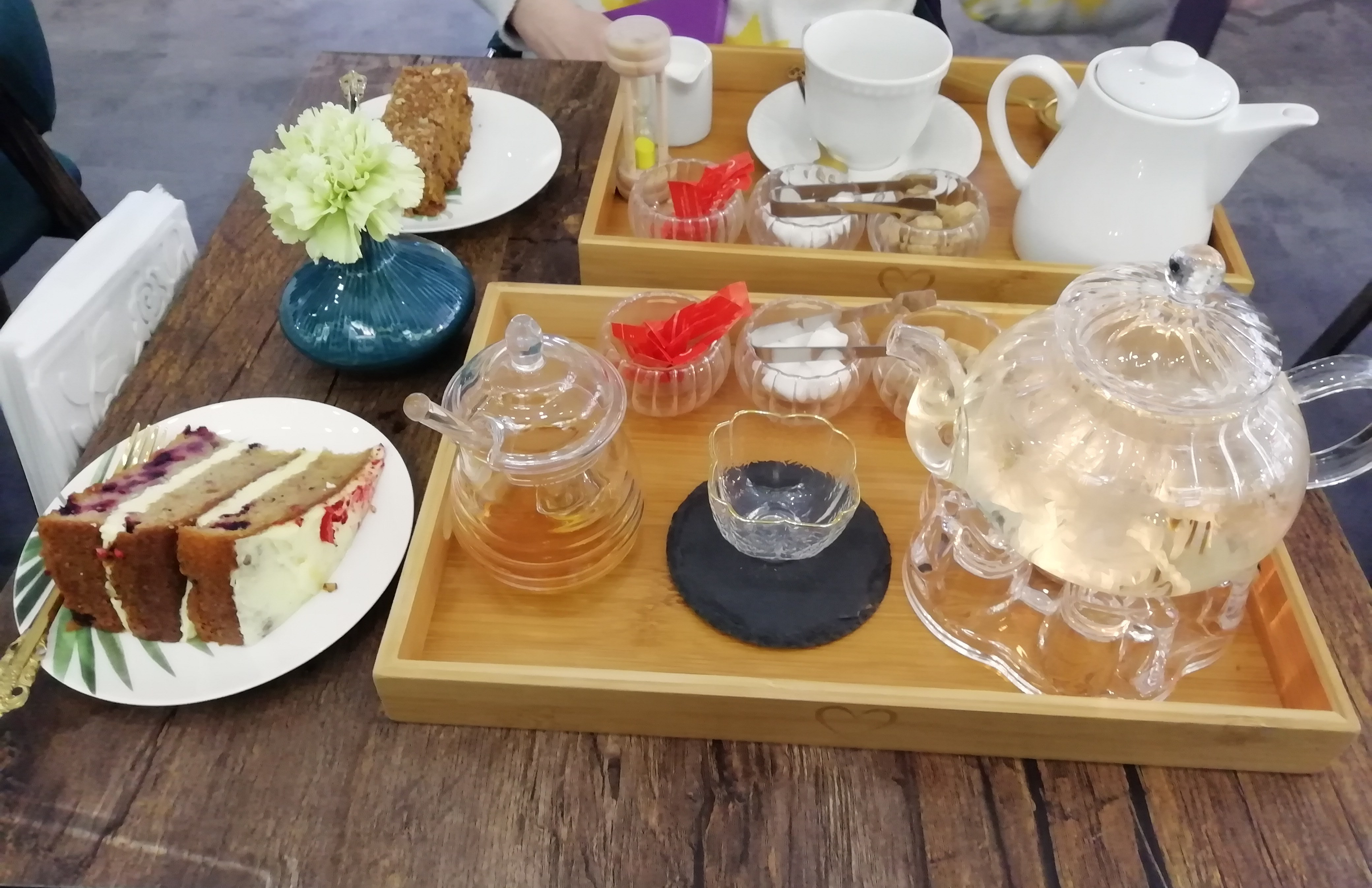 Trays of tea and pieces of cake