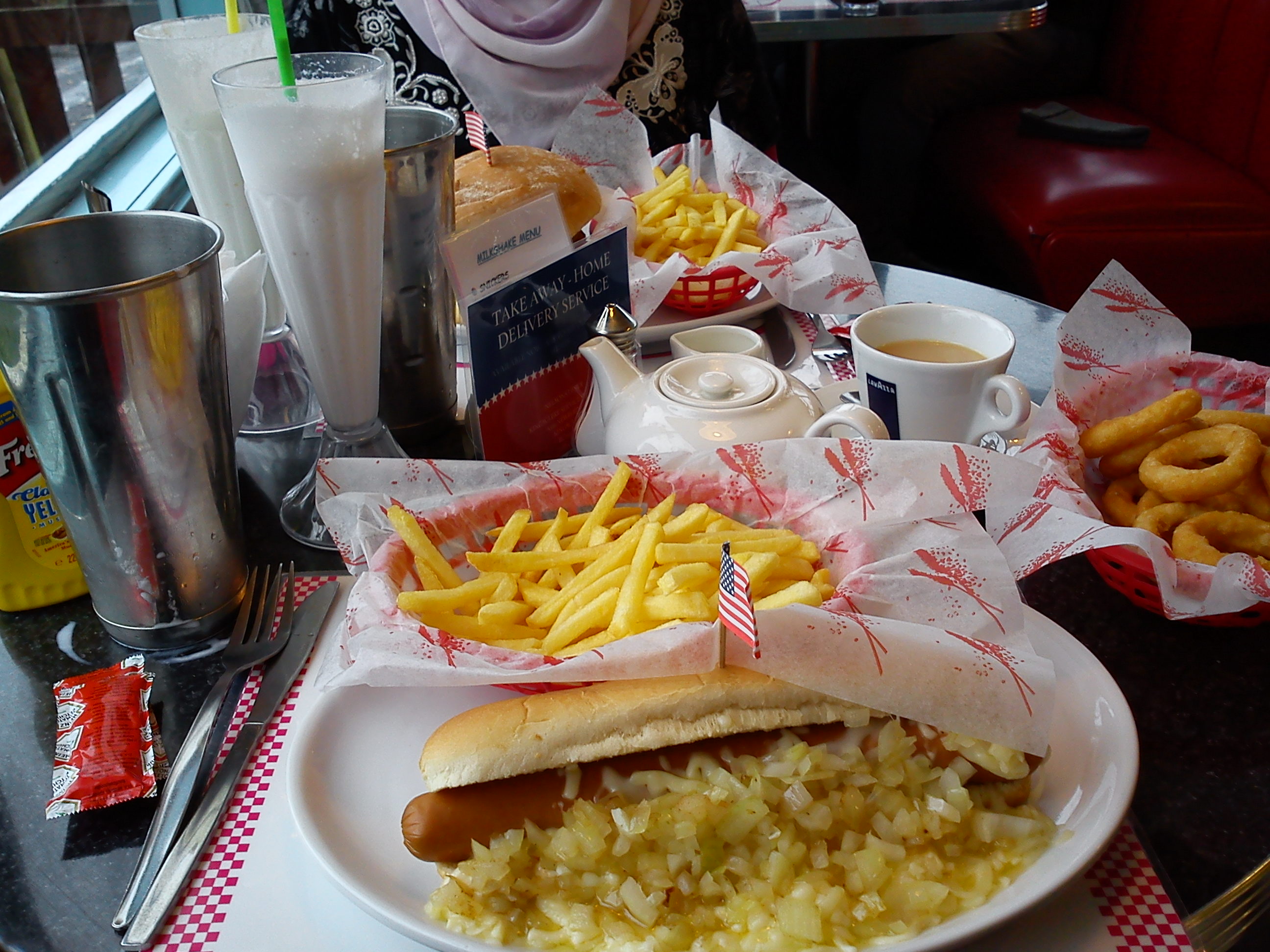 Price? £1.70 for the tea, £2.70 for the strawberry shake, £3.85 for the ginger shake, £7 for cheesy hot dog, £9.50 for a ‘Houston’ burger, £2.95 for onion rings and £4.85 for some very tasty pancakes.