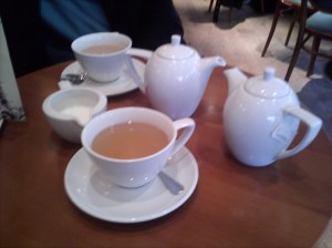 The tea was not loose leaf but a Clipper decaf teabag. It’s my fault the tea looks watery – I added it to the pot but was a bit impatient and didn’t let it brew long enough.