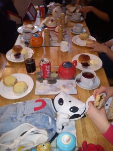 There was a wide range of food – breakfast, lunch, afternoon cakes and scones – and a good choice of tea as well. We’d had breakfast very late that day and so even though this was the afternoon we couldn’t quite get our heads round what meal this should be, but we were all hungry and in need of tea, so we just ordered whatever we felt like. This resulted in an intriguing mix of sandwiches, scones, fizzy drinks, tea and toasted crumpets with melted cheese on top. The crumpets sounded so enticing that I went to the counter to add some to my order after the waitress had left (all in the interests of research, naturally).