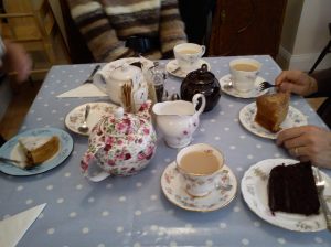 The tables and chairs are nice and solid, with pretty tablecloths and flowers in vases. The china is patterned and a mix of different styles and colours and we all enjoyed seeing which teapot we got given. There were shelves high up on the wall with many different teapots on and while we were eating a couple brought in an unusual teapot for the owners to add to the collection on display in the tearoom.