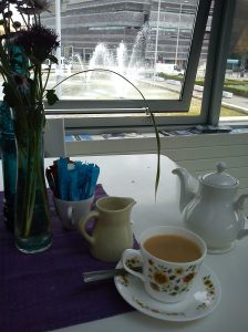 The tea came in a teapot with a retro cup and saucer. I sat upstairs so I could gaze out the window at the fountains and the bay. Each table had a little vase of flowers and again the atmosphere was very calm.
